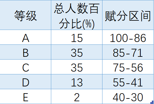 划分为5个等级,各比例的赋分区间分别如下(仅供参考):