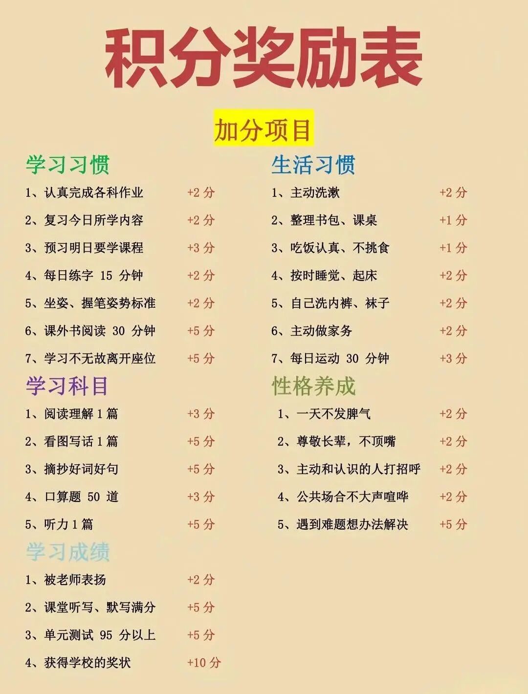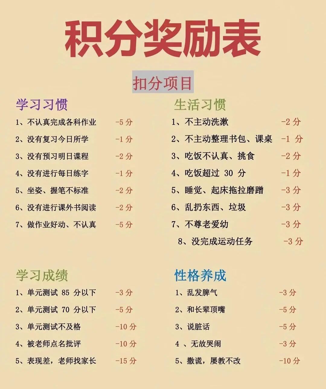 除了加分项目,也可以设定合理的扣分项目,帮助孩子规范行为习惯。具体扣分规则如下: