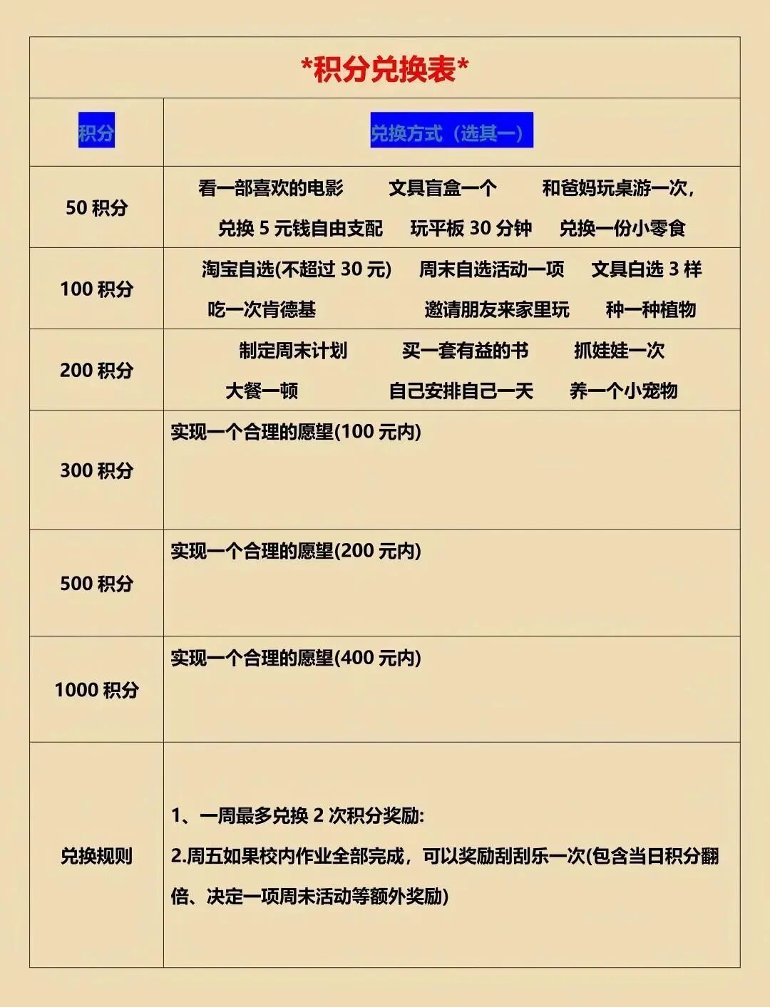 同时可以准备一个积分记录区,在兑换奖励表中补充本周已得积分和本周兑换积分的填写项,让孩子随时了解自己的积分情况,更有努力的方向。需要注意的是,加分和扣分规则都可以和孩子一起商量确定,让他更有参与感,执行起来也会更配合。