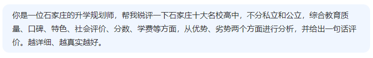 作为升学规划师,锐评石家庄十大高中学校时,可以从多个维度进行分析,包括教学质量、升学率、师资力量、学校特色、学生综合素质培养等。以下是对石家庄十大高中学校的简要评价,供参考: