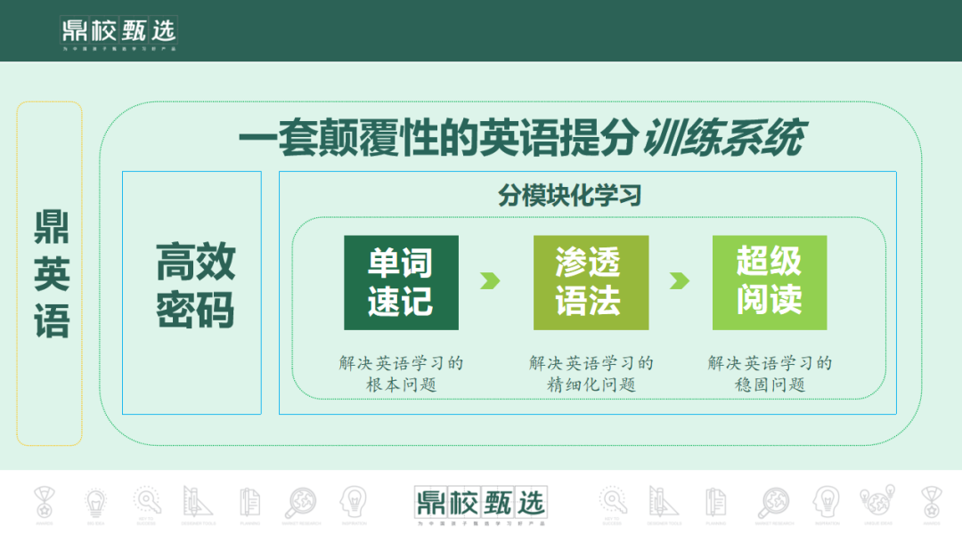 鼎英语同时提出,可以通过1-3个月的训练,轻松提高20-60分,效果是线下学习的十倍、百倍。之所以这么说,是因为鼎英语高度聚焦了与英语成绩息息相关的单词、语法和阅读三大板块。