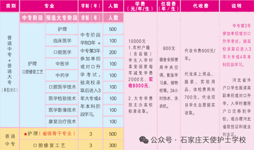 在校中专学生,第三年可报名参加河北省“对口单招”升学考试,升入专、本科相关高等院校学习。升学方式简单,升学率高,是上大学的最快捷径,学习期满颁发全日制统招大专、本科毕业证书,国家承认学历,教育部学信网可查。学生考入普通高等院校的升学率达到较高水平,学生考入的普通高等院校有:河北中医学院(本科)、河北北方学院(本科)、张家口学院(本科)、河北外国语学院(本科)、沧州医学高等专科学校、邢台医学高等专科学校、承德护理职业学院、廊坊卫生职业学院等。