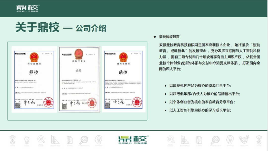 通过创新的商业模式和赋能体系,帮助合伙人实现零风险、高收益的创业目标。通过经营用户需求,打破传统教培机构的局限,鼎校甄选为家长和孩子提供长期的教育解决方案,同时为合伙人创造了可持续的盈利模式。