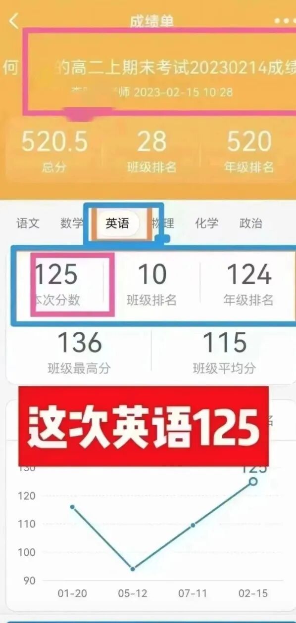 案例一:高二学员,22次单词课,英语从90分提升到125分,进步35分!