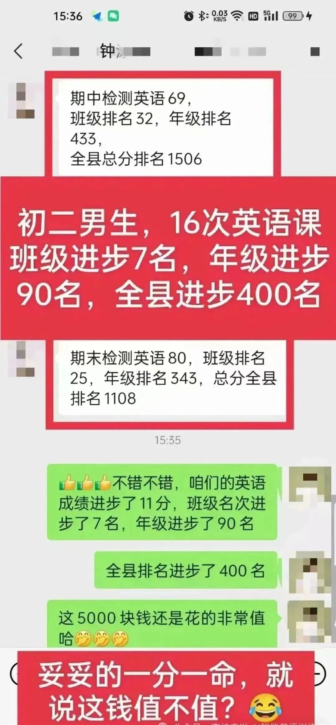 学生初二,上了16次英语单词课,班级进步了7名,年级进步了90名,全县进步了400名。咱就说,孩子d进步值不值得表扬。