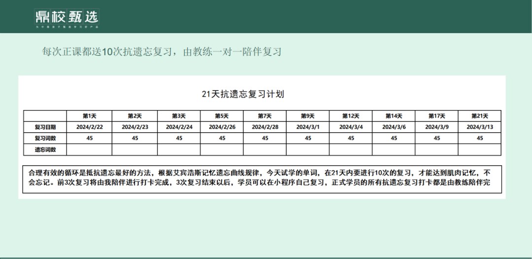 功效3:不遗忘,一次训练+10次抗遗忘复习+九宫格循环复习+阶段性复习+单词在文章中应用,短暂记忆到永久记忆。