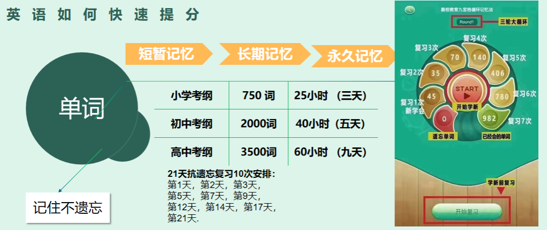 学生从记第一个单词开始,5个单词为一组,3组为一关,3关为一章,我们通过组循环,组组循环,关循环,关关循环,章循环,章章循环,每一个单词都呈紧密而有序排列,最后形成记忆网结构,不容易遗忘。