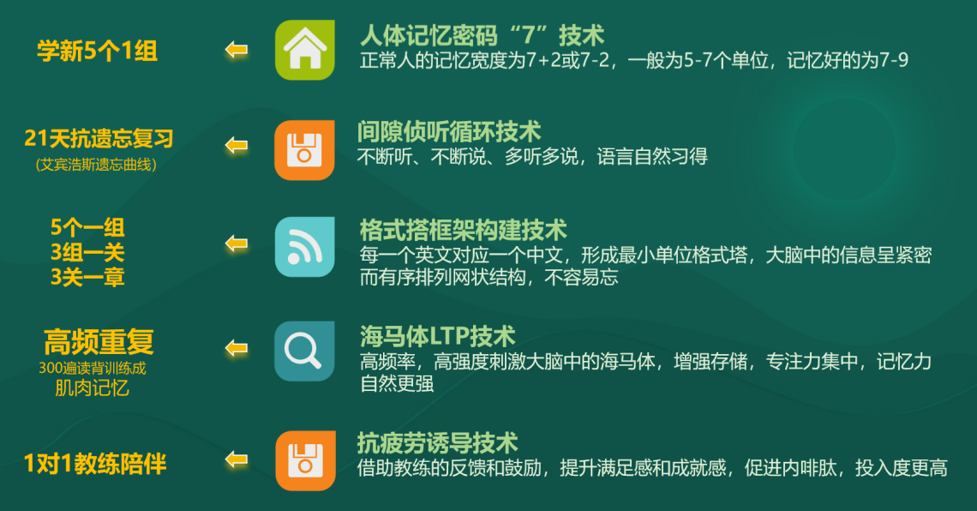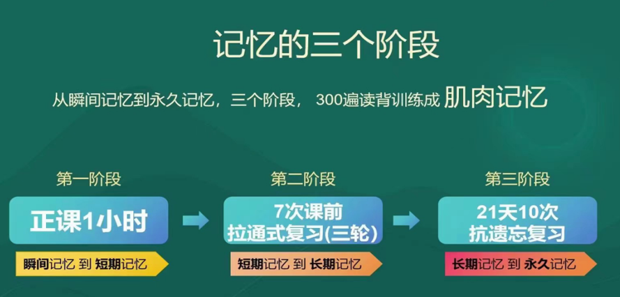 这个课程在上课的时候,是需要学生跟着教练不断地读,不断地说,大量的开口。根据”语言是习得而来“的核心理论,合理的有序的循环是抵抗遗忘最根本的方法,当我们合理有序循环到7x7=49次时就可以达到短期记忆,重复到150-160次就可以达到长期记忆,重复到300次左右的时候就可以达到永久性记忆,在根据人体的抗遗忘规律去做抗遗憾动作就能够确保孩子100%不会遗忘
