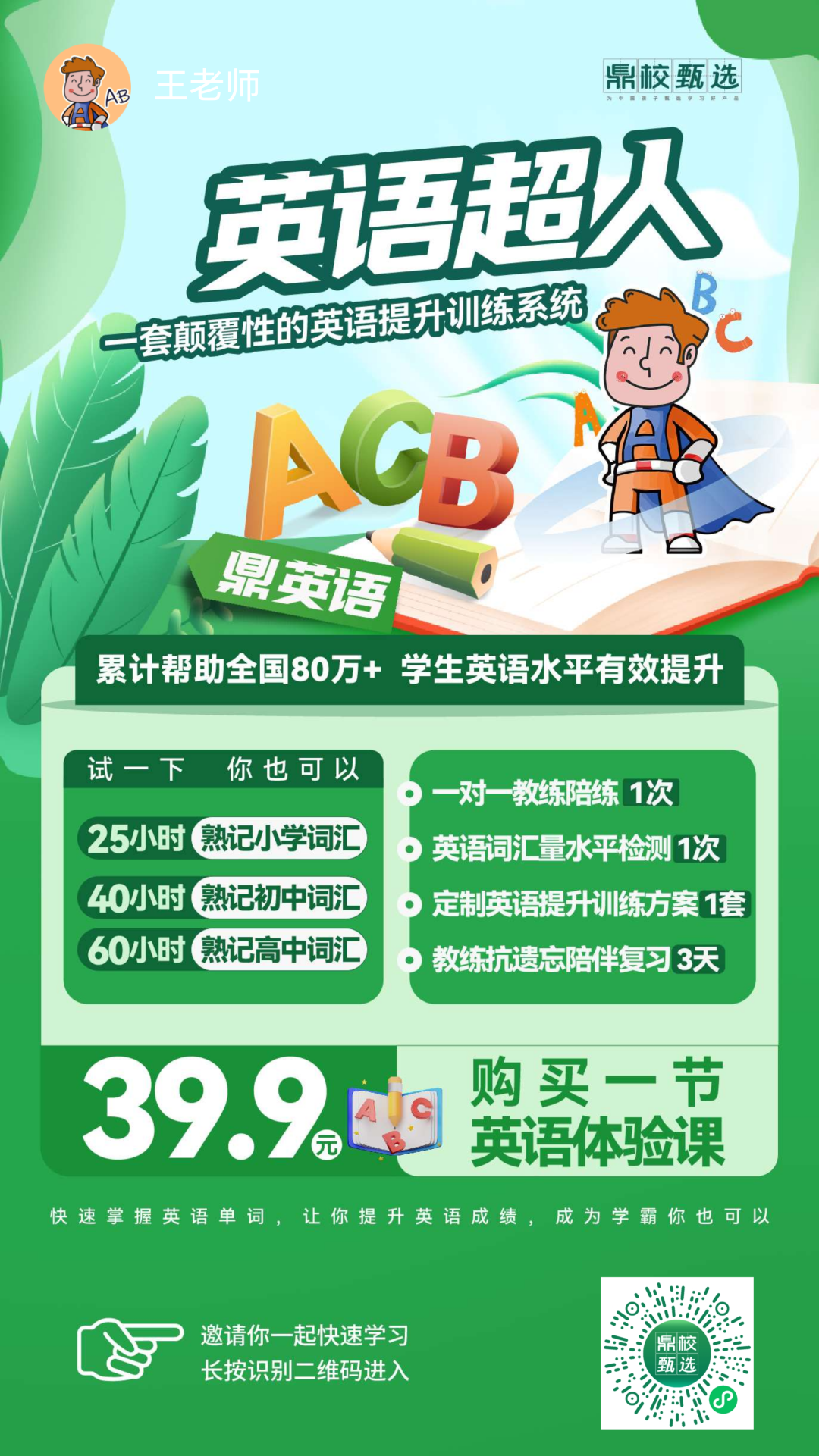 鼎英语 这个课程可以让孩子在三天 ,五天 ,七天就可以把三年的考纲单词全部识记完成 ,并且确保孩子能够全部吸收 ,记得住 ,不会忘;再通过语法模块解决孩子精细化的翻译水平 ,具 备做对题的能力 ,最后通过阅读模块解决孩子真正的应用问题 ,通过三个模块的训练就可以让孩子在 1-3 个月之内 快速提分 20-60 分!
