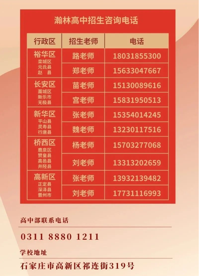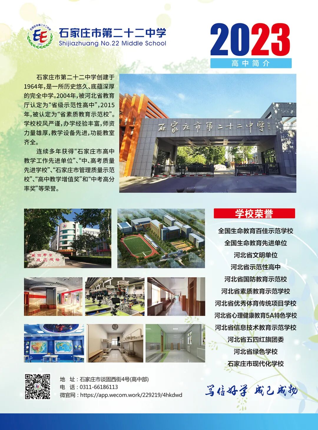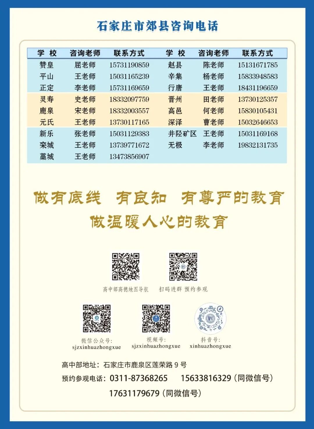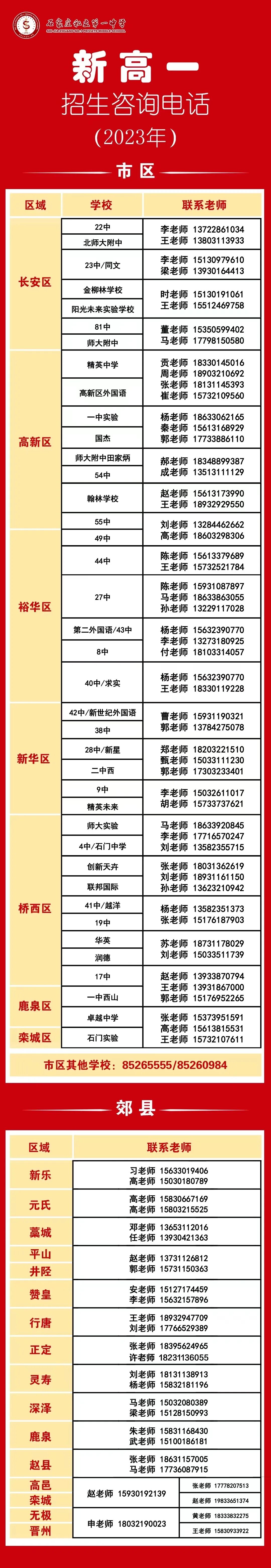 2023年高一招收新生305人,文化生131人,体育10人,美术14人,书法生150人(市内五区145人,含自主招生15人;藁城、鹿泉、栾城新三区5人),欢迎广大考生报考。