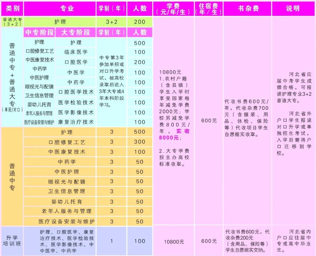 在校中专学生,第三年可报名参加河北省“对口单招”升学考试,升入专、本科相关高等院校学习。升学方式简单,升学率高,是上大学的最快捷径,学习期满颁发全日制统招大专、本科毕业证书,国家承认学历,教育部学信网可查。我校学生考入普通高等院校的升学率达到较高水平,学生考入的普通高等院校有:河北中医学院(本科)、河北北方学院( 本科 )、张家口学院(本科 )、河北外国语学院(本科)、沧州医学高等专科学校、邢台医学高等专科学校、承德护理职业学院、廊坊卫生职业学院等。