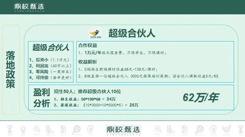 通过创新的商业模式和赋能体系,帮助合伙人实现零风险、高收益的创业目标。通过经营用户需求,打破传统教培机构的局限,鼎校甄选为家长和孩子提供长期的教育解决方案,同时为合伙人创造了可持续的盈利模式。
