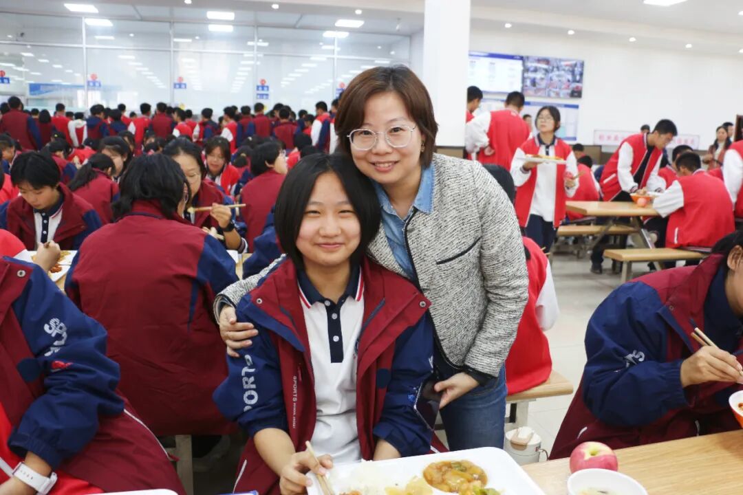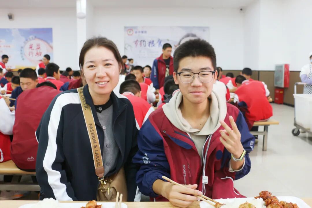 ▲家长品尝食堂饭菜并与孩子合影留念